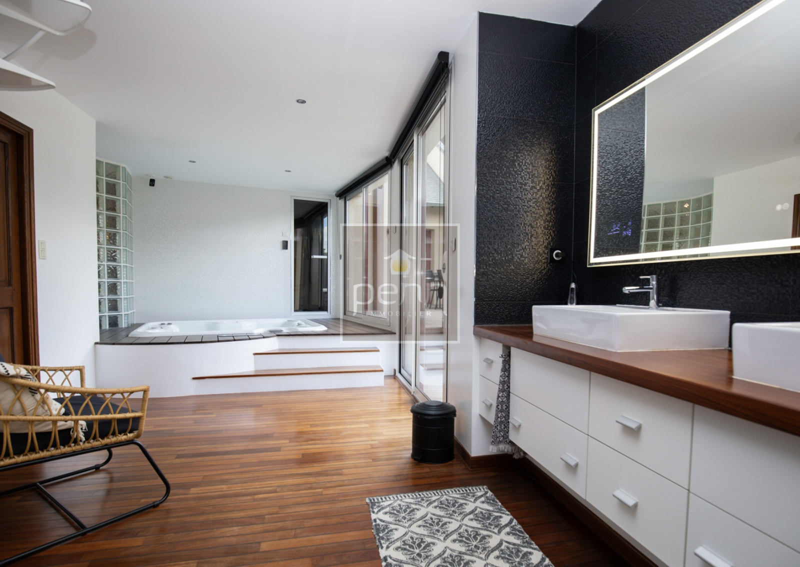 Vitré (35500)RARE ! Sur les HAUTEURS DE VITRE dans un CADRE PRIVILEGIE avec VUE SUR LE CHATEAU ! Venez découvrir cette PROPRIÉTÉ D'EXCEPTION D'ARCHITECTE à 15 mn à pied du CENTRE-VILLE ! Cette propriété contemporaine de charme style longère de 367 m² habitables a des prestations extrêmement séduisantes. Vous y découvrirez une entrée spacieuse menant à un grand salon sur parquet avec cheminée, un séjour convivial où vous pourrez accueillir de nombreux invités, une cuisine aménagée et équipée haut de gamme (réalisée par un menuisier avec un piano Lacanche 3 fours...) ouverte sur 2 magnifiques terrasses, un dégagement nous conduit, en passant par un jardin d'hiver, à une suite parentale de plus de 50 m² avec son dressing et sa salle d'eau (avec un HAMMAM EN BETON CIRE et un ciel étoilé, SPA INTERIEUR), wc avec lave-mains. Pour le côté fonctionnel, on y trouve également une arrière-cuisine aménagée et équipée avec nombreux rangements et un vestiaire, ainsi qu'une lingerie avec penderie. L'étage accueille une mezzanine avec un salon d'étage et un espace billard, 3 chambres, une salle de jeux avec verrrière, une salle de bain, un espace bureau, une salle de sport (on peut créer des chambres supplémentaires dans le voulme existant) et des wc. Pour vos moments de détente, vous bénéficierez également d'un salon extérieur avec son SPA DE NAGE et une douche extérieure. Cette demeure haut de gamme se distingue par son élégance et son agencement atypique. Un garage double avec carport pour 2 voitures, un atelier ainsi que 2 pièces aménagées au dessus qui peut devenir un lieu de rdv idéal pour vos enfants. Cette demeure est implantée sur un terrain clos et paysagé très soigné d'environ 1 900 m² avec un portail électrique. Cette maison bénéficie de prestations exceptionnelles, ainsi que la domotique pour les ouvertures électriques, un système de caméras, le chauffage par le sol, des parquet en chêne, de la tomette, des enduits à la chaux... C'est le moment de changer de maison et de se faire plaisir !